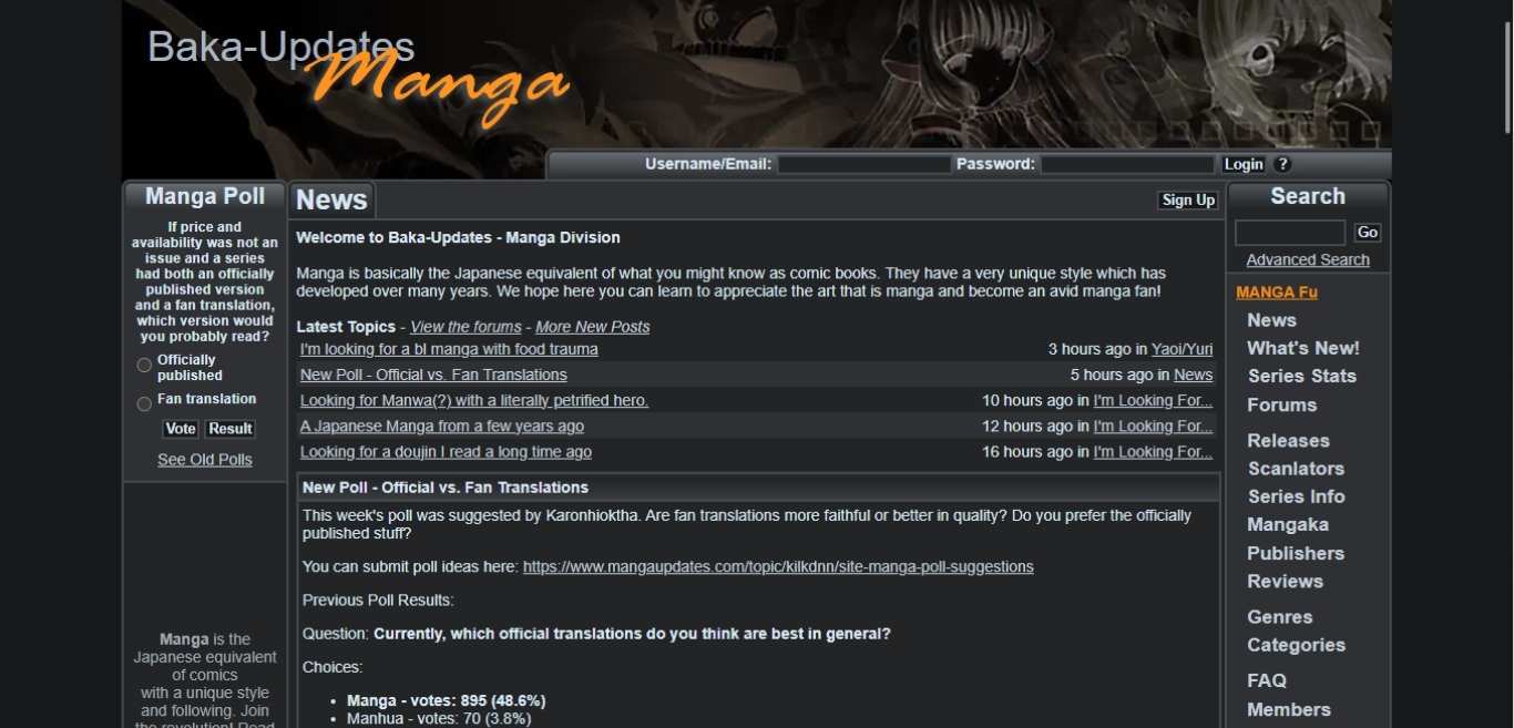 - Pros: Best source for manga, and scanlation updates.